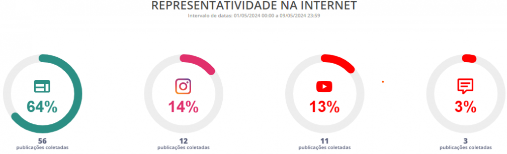 A maior parte das menções às enchentes no Sul também esteve concentrada em Portais (64%) com um percentual idêntico ao Brasil (65%). Em seguida, Instagram com 14% e YouTube com 13%.