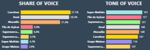 As marcas com maior visibilidade, porém, não geraram a melhor percepção do público no período estudado. Assim, o ranking muda quando a análise sai da quantidade de menções e passa para a qualidade das mesmas. Nesse outro recorte, o Grupo Muffato lidera com 161 pontos no critério tone of voice, embora apareça com tímidos 4,1% na dimensão share of voice.
