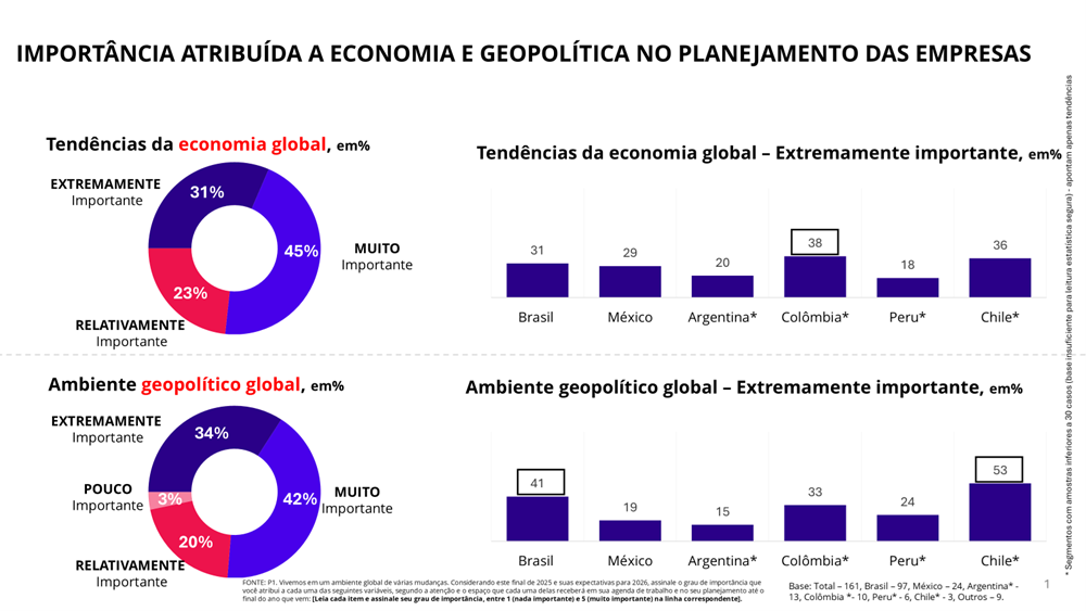 As sensibilidades da economia global são consideradas “muito importantes” (45%) ou “extremamente importantes” (31%) para definir o planejamento empresarial para 2026 na América Latina. E o quadro do ambiente geopolítico é fator “muito importante” (42%) ou “extremamente importante” (34%) no processo de formulação de estratégias para 2026 (gráfico 1). Esta forte relevância do cenário internacional no mapa de negócios da América Latina é um dos resultados de levantamento junto a lideranças de 160 organizações de Argentina, Brasil, Chile, Colômbia, Equador, México e Peru durante os meses de agosto e setembro. O trabalho foi realizado pelo PROI Latam Squad, grupo de agências de PR da região que atua de forma integrada no âmbito da rede global PROI Worldwide, presente em mais de 80 países.