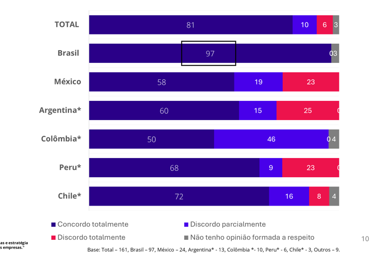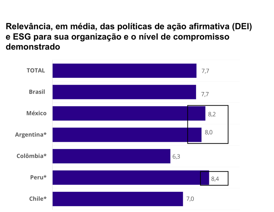 As questões relativas a ESG e DEI (diversidade, equidade e inclusão) têm especial apelo no Peru. Lá, numa escala de zero a 10, as empresas se declaram na média em nível 8,4 em relação a compromissos com aquelas práticas, seguidas por México e Argentina com 8,2 e 8,0 respectivamente (gráfico 10).