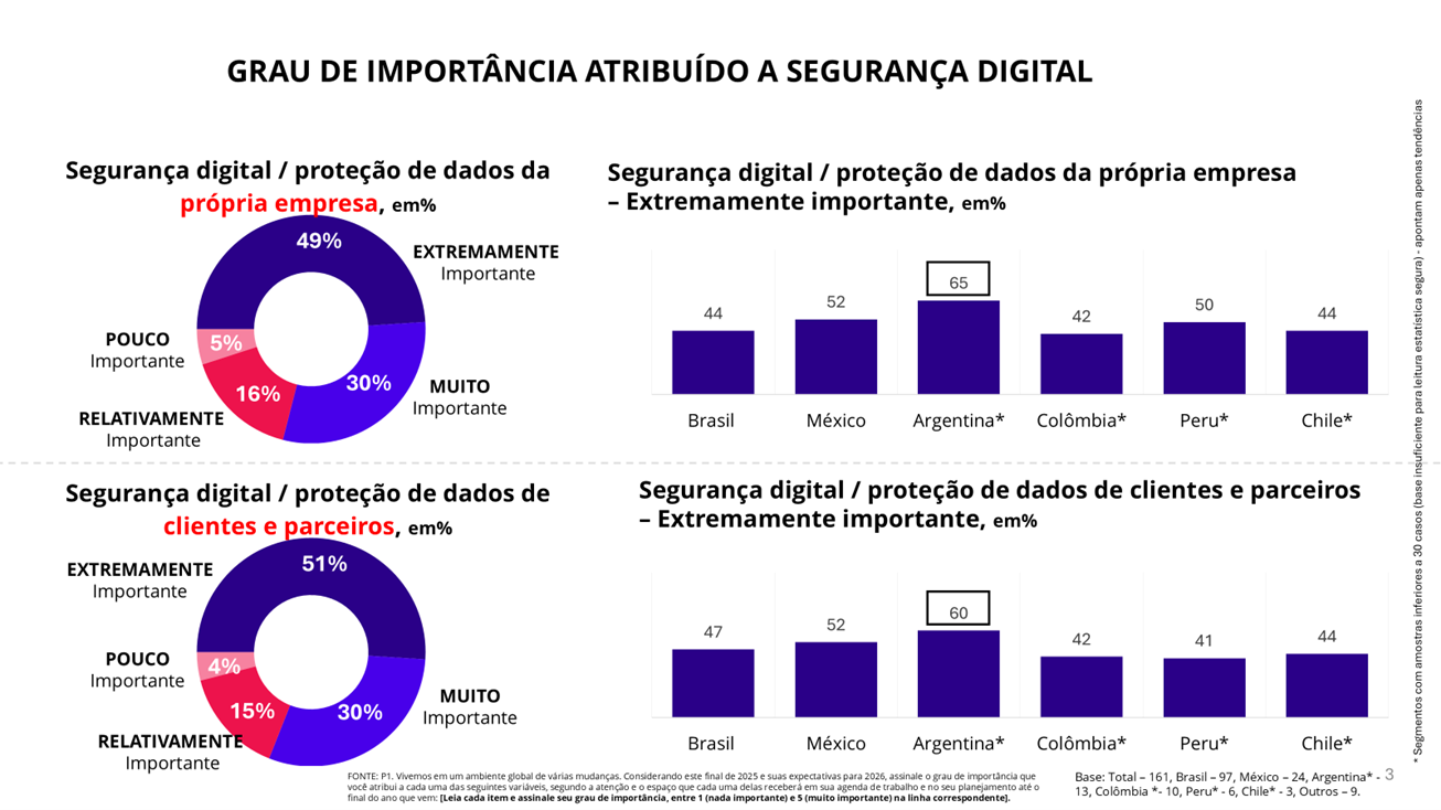 Quando o assunto é segurança digital um mercado específico da América Latina se destaca. Enquanto a proteção dos próprios dados é considerada “extremamente importante” por 49% das 160 empresas daqueles sete países a preocupação com o tema atinge 65% no caso das organizações argentinas pesquisadas. Quando se trata da segurança de dados de clientes e parceiros de negócios, 50% das respostas na região como um todo apontam essa variável como “extremamente importante”, enquanto na Argentina esse índice sobe a 60% (gráfico 3).