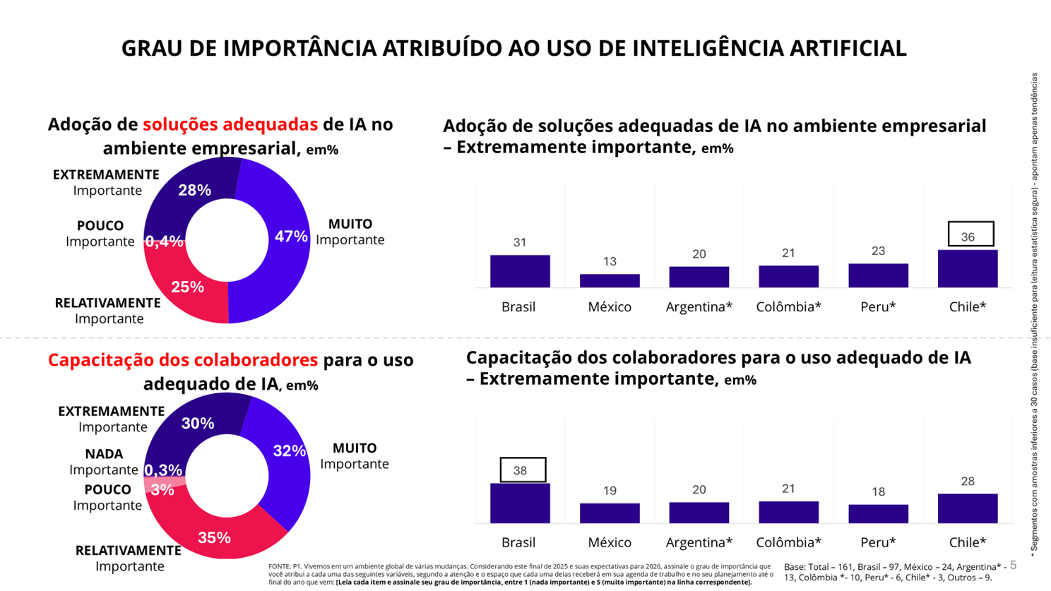 O compromisso em relação a soluções adequadas de inteligência artificial no ambiente corporativo é considerado “extremamente importante” por apenas 28% do conjunto das 160 entrevistadas (maior índice está no Chile, com 36%), e apenas 30% delas faz o mesmo julgamento em relação a capacitação dos colaboradores para o uso de IA (38% no caso do Brasil; gráfico 4).