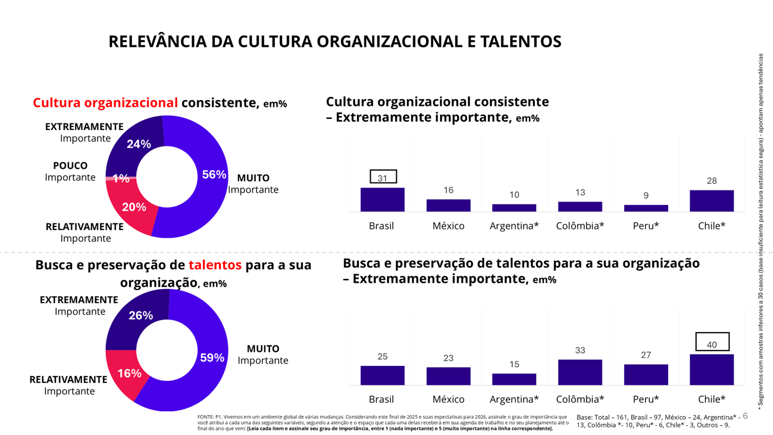 Uma cultura organizacional consistente é preocupação prioritária para 24% das organizações (31% no caso do Brasil), enquanto a busca e preservação de talentos é “extremamente importante” para 26% das organizações (pico de 40% no caso do Chile; gráfico 5).