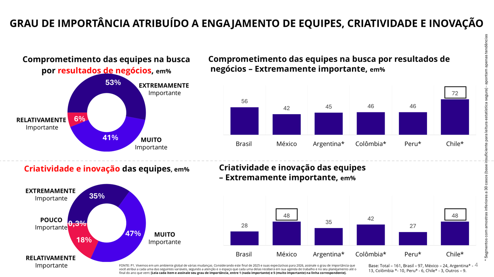 Engajar adequadamente as equipes de trabalho na busca por efetivos resultados de negócios é uma prioridade para 53% do conjunto das 160 empresas, mas esse índice alcança 72% no caso das companhias chilenas. Ao mesmo tempo, garantir criatividade e inovação por parte das equipes é objetivo declarado de 35% das empresas, mas no México e no Chile esse índice é bem maior: 48% (gráfico 6).