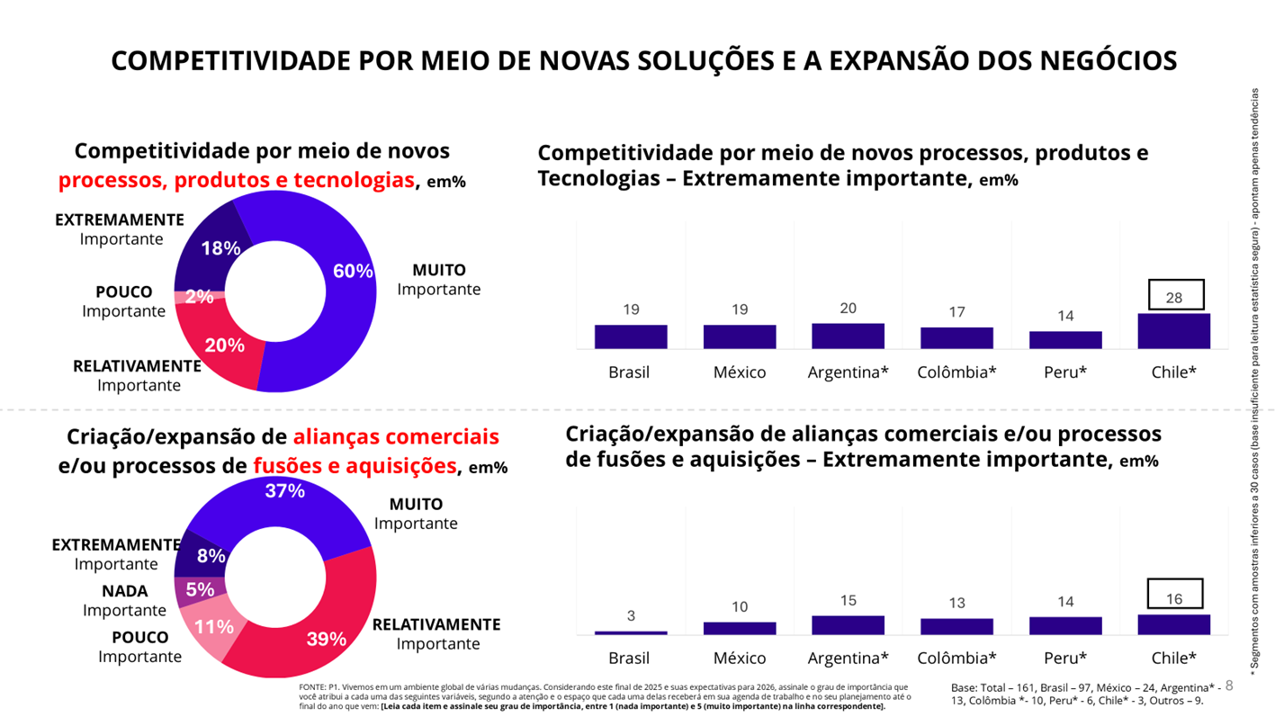 Quando o assunto são as alianças de negócios ou processos de fusões e aquisições, os números também são baixos: apenas 8% das empresas consideram esse caminho uma prioridade. O índice mais baixo está no Brasil, com 3%, e o mais alto no Chile, com 16% (gráfico 8).