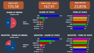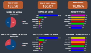 O conteúdo é predominantemente positivo em relação a todas as marcas. O índice qualitativo de Tone of Voice, que vai de zero (extremo negativo) a 200 (extremo positivo) fica em 135,6 para o total da amostra. Apesar de presente em apenas 20% das menções no universo pesquisado, o tema “híbrido” gera um ganho de imagem de 24%, em média (no caso, o Tone of Voice vai a 167,9).